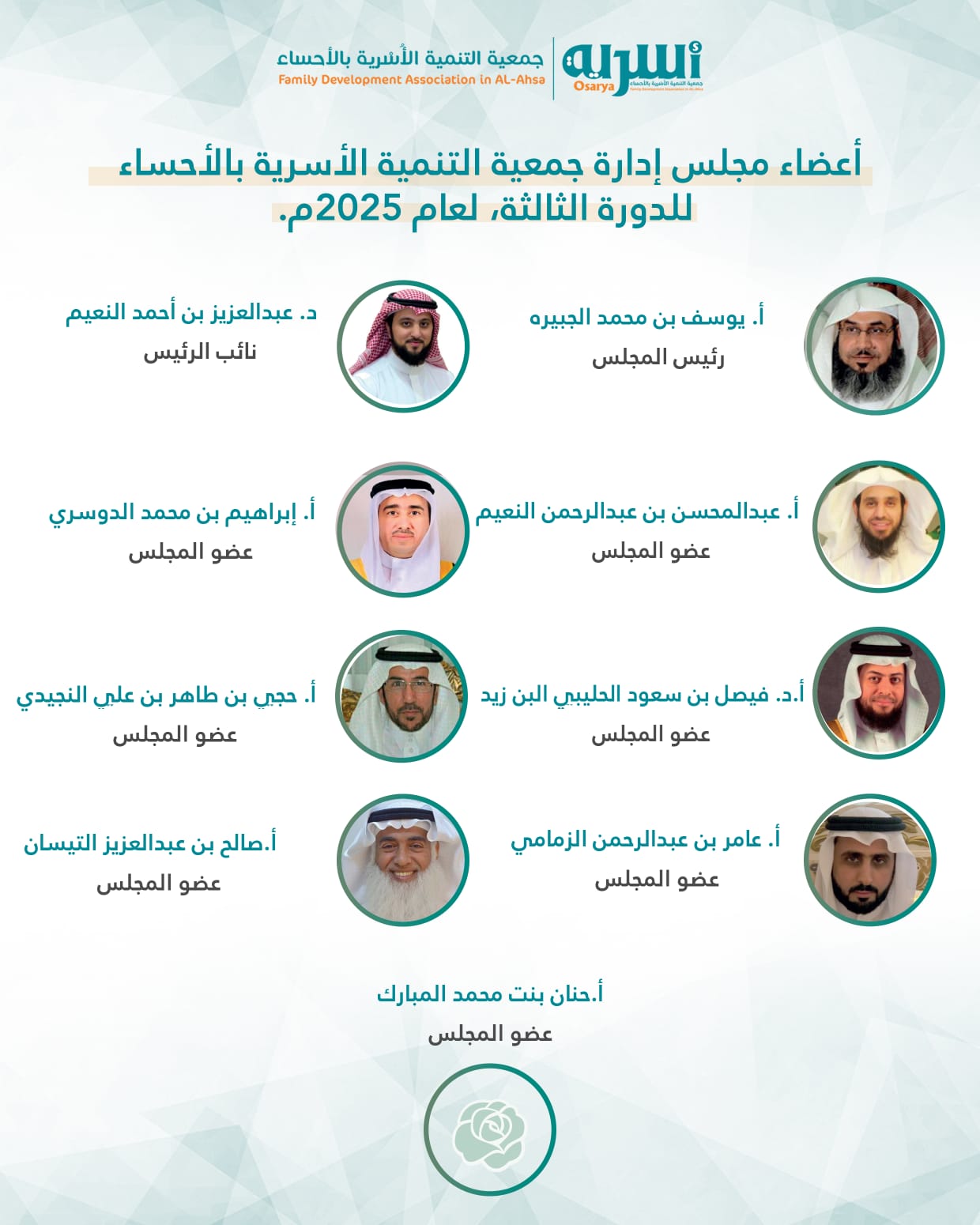 تم تشكيل المجلس بناءً على القرار الصادر من المركز الوطني للقطاع الغير ربحي رقم NBM035797 وتاريخ 38 / 12 / 2025 م باعتماد مجلس ادارة الجمعية وفقًا لما يلي :