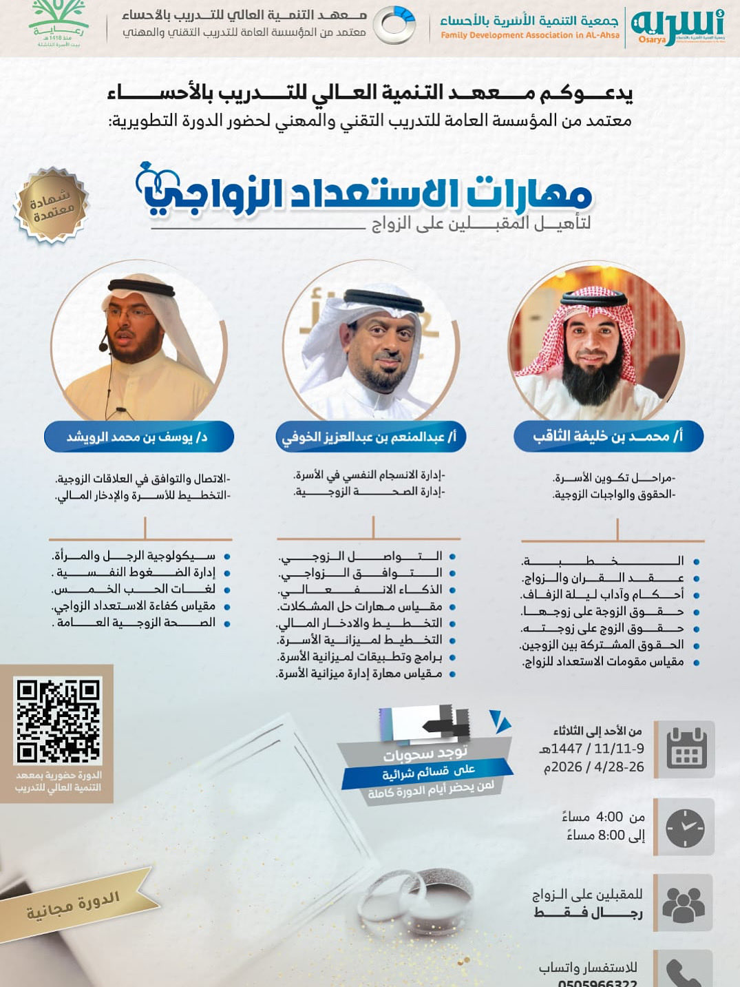 🔹الفئة المستهدفة: للمقبلين على الزواج وحديثي الزواج “رجال فقط”