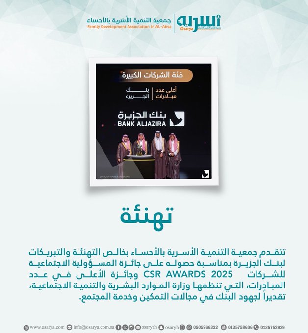 تهنئة تتقدم جمعية التنمية الأسرية بالأحساء بخالص التهنئة والتبريكات لبنك الجزيرة